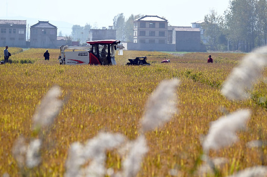 在安徽省宿州市埇橋區(qū)夾溝鎮(zhèn)鎮(zhèn)頭村,村民駕駛收割機(jī)收割水稻。資料照片