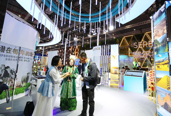 11月6日,一名參觀者(右)在第六屆進(jìn)博會(huì)國(guó)家展哈薩克斯坦展臺(tái)與工作人員交談。第六屆進(jìn)博會(huì)國(guó)家展全面恢復(fù)線下舉辦,洪都拉斯、塞爾維亞、越南、南非、哈薩克斯坦作為本屆進(jìn)博會(huì)主賓國(guó)在國(guó)家展亮相?!⌒氯A社記者 方喆 攝