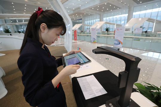 中國(遼寧)自由貿(mào)易試驗(yàn)區(qū)沈陽片區(qū)“渾南會(huì)客廳”內(nèi),工作人員在幫助企業(yè)上傳文件。記者 楊青 攝
