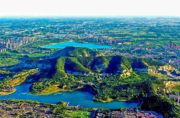 從水泊梁山風(fēng)景區(qū)上空俯瞰梁山縣城周邊全貌