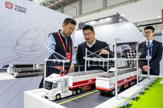 12月8日,在2023中國國際軌道交通和裝備制造產(chǎn)業(yè)博覽會上,觀眾(左一)了解一款智能貨車。新華社記者 陳思汗 攝