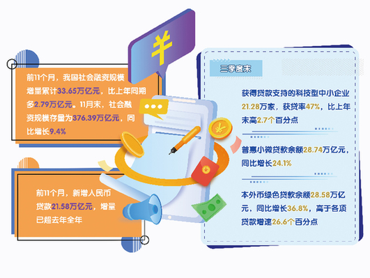 12月13日人民銀行披露的數(shù)據(jù)顯示,前11個(gè)月,我國社會(huì)融資規(guī)模增量累計(jì)33.65萬億元,比上年同期多2.79萬億元。與此同時(shí),前11個(gè)月貸款增量達(dá)21.58萬億元,已超去年全年。在貨幣政策總量和結(jié)構(gòu)性工具合力支持下,金融助力實(shí)體經(jīng)濟(jì)恢復(fù)向好,科技創(chuàng)新、綠色低碳等重點(diǎn)領(lǐng)域企業(yè)資金“獲得感”也有所增強(qiáng)。
