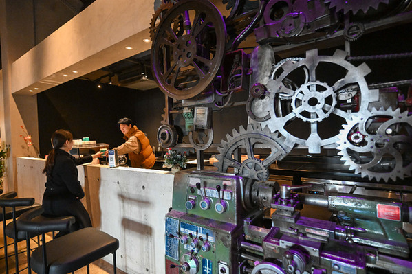 圖為1月3日,產(chǎn)業(yè)會(huì)客廳內(nèi)的一家工業(yè)風(fēng)咖啡店在試營(yíng)業(yè)中?!∮浾摺O凡越 攝