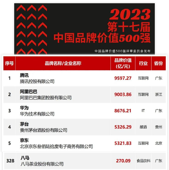 1月18日,第十七屆中國(guó)品牌價(jià)值500強(qiáng)榜單正式揭曉,八馬茶業(yè)再度入選,與騰訊、阿里巴巴、華為、茅臺(tái)、京東等知名品牌共同上榜,并以270.09億元的品牌價(jià)值,再次刷新品牌歷史排名,較上年提升10位,名列榜單第328位。