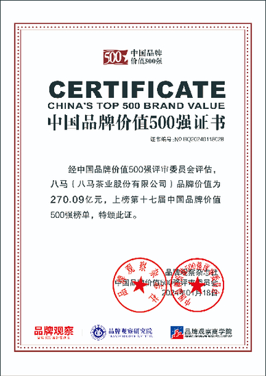 第十七屆中國(guó)品牌價(jià)值500強(qiáng)榜單正式揭曉,八馬茶業(yè)再度入選,以270.09億元的品牌價(jià)值,刷新品牌歷史排名,較上年提升10位,名列榜單第328位。