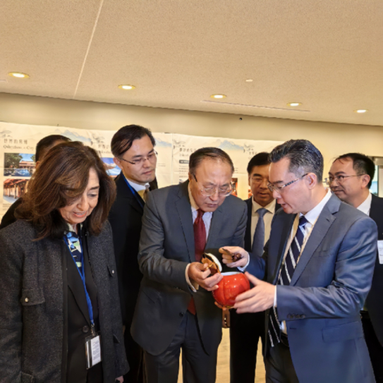 △中國(guó)常駐聯(lián)合國(guó)代表張軍(中)等嘉賓在聯(lián)合國(guó)總部聽(tīng)取國(guó)家級(jí)非遺傳承人、八馬茶業(yè)董事長(zhǎng)王文禮(右二)介紹八馬東湖之光·賽珍珠鐵觀音