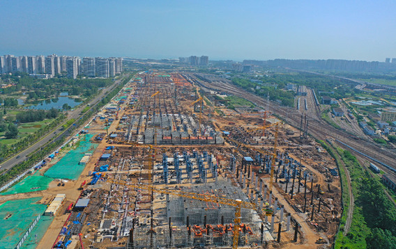 “截至目前項目已經完成主體工程施工,正在進行室內裝飾裝修和外立面裝修,以及室外配套工程施工。”項目施工方中鐵廣州局集團??谛潞8酆湍细邸岸€口岸”(貨運)集中查驗場所建設項目總工程師李欽臣說,為保障工期節(jié)點,項目投入近2000名工人。