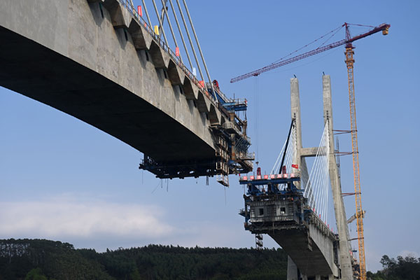 圖為在廣西南寧南深高鐵南玉段六律邕江特大橋建設(shè)現(xiàn)場,中鐵十四局集團(tuán)工人在建設(shè)施工中。新華社記者 陸波岸 攝