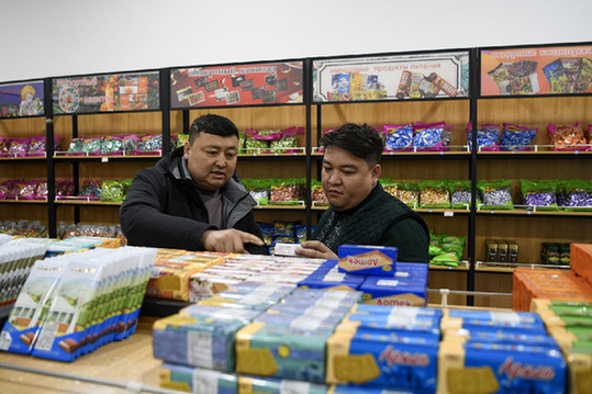 巴吾江·賽別克(左)在查看剛運到的進(jìn)口食品(1月16日攝)。記者 趙戈 攝