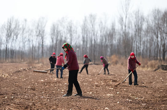 3月7日,青海省海東市民和回族土族自治縣中川鄉(xiāng)光明村村民張存蘭(前)在平整土地準(zhǔn)備播種?!∮浾摺堼垺z
