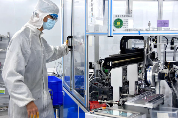 3月7日,工作人員在陜西軒意光電科技有限公司生產(chǎn)線前作業(yè)?!∮浾摺埑靠 z