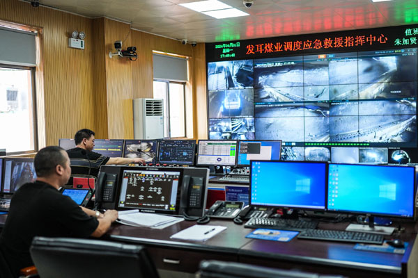 2018年,發(fā)耳煤礦在貴州率先建成智能化綜采工作面,成為貴州省第一家實現綜采工作面智能化、生產輔助系統(tǒng)信息化的礦井。圖為4月1日,發(fā)耳煤業(yè)工作人員在調度應急救援指揮中心工作。記者 陶亮 攝