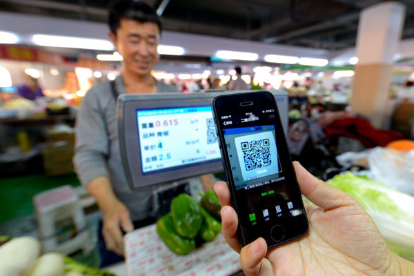 在河北省邯鄲市一家便民市場,消費(fèi)者在掃碼支付購買蔬菜。