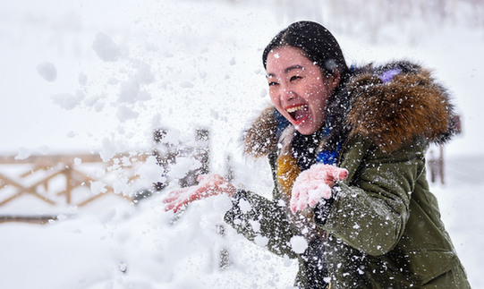 長白山景區(qū)內(nèi)玩雪的游客?!∮浾摺⊥蹶伙w 攝