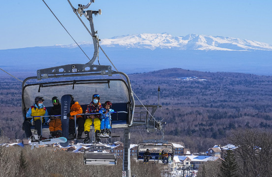 長白山西坡的萬達滑雪度假區(qū)內(nèi),雪友乘坐纜車上山?!∮浾摺≡S暢 攝