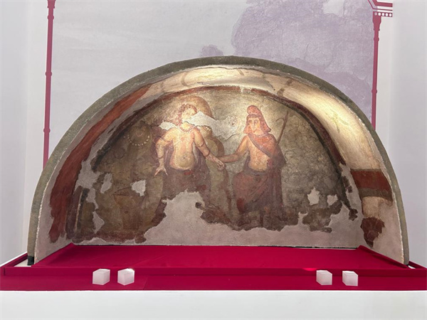 ??這是“描繪珀耳修斯和安德羅墨達(dá)的彩繪石膏壁畫”(真品)(6月13日攝)。新華社記者 張玉潔 攝