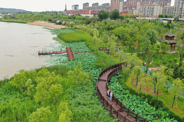 游人在富平石川河國家濕地公園岸邊景觀步道上觀景賞花(6月21日攝,無人機照片)。記者 李賀 攝