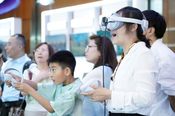 7月2日至5日,以“開啟數(shù)智新時代,共享數(shù)字新未來”為主題的2024全球數(shù)字經(jīng)濟大會在北京國家會議中心舉辦。圖為7月2日,觀眾在2024全球數(shù)字經(jīng)濟大會數(shù)字經(jīng)濟沉浸式體驗區(qū)體驗一款VR設(shè)備。新華社記者 任超 攝