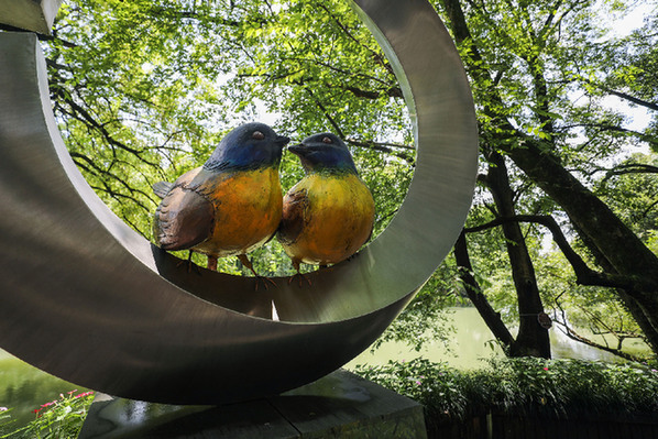 7月3日,在石門村拍攝的藍冠噪鹛雕塑?!∮浾摺《艦t逸 攝