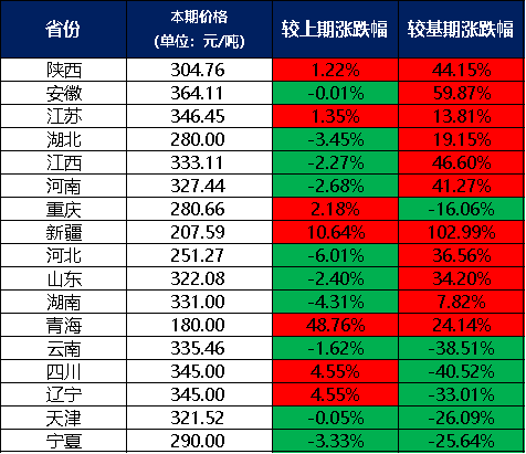 分價(jià)格區(qū)間來看,本期兩堿工業(yè)鹽單價(jià)在300元/噸及以上的地區(qū)有11個(gè),是陜西、安徽、江蘇、江西、河南、山東、湖南、云南、四川、遼寧、天津;兩堿工業(yè)鹽單價(jià)在300元/噸以下的地區(qū)有6個(gè),分別是湖北、重慶、新疆、河北、青海、寧夏。
