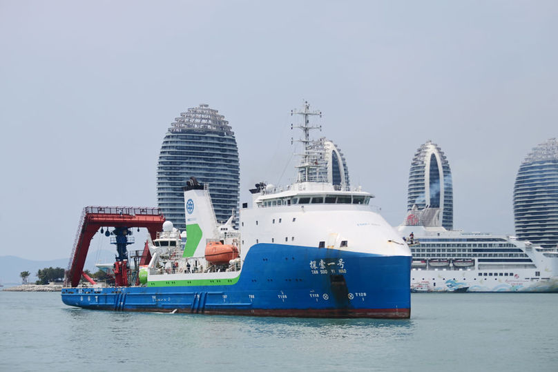 ??“探索一號”科考船搭載“奮斗者”號全海深載人潛水器返回海南三亞(2024年3月28日攝)。此次科考歷時50天,順利完成中國-印度尼西亞爪哇海溝聯(lián)合深潛任務。新華社發(fā)(沙曉峰 攝)