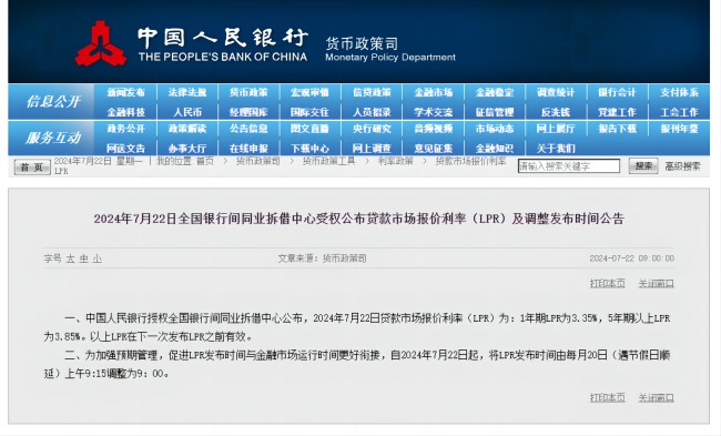 此外,為加強預(yù)期管理,促進LPR發(fā)布時間與金融市場運行時間更好銜接,央行表示,自2024年7月22日起,將LPR發(fā)布時間由每月20日(遇節(jié)假日順延)上午9:15調(diào)整為9:00。