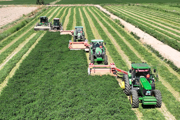 眼下,在巴彥淖爾市磴口縣包爾蓋農(nóng)場(chǎng)有機(jī)苜蓿產(chǎn)業(yè)園區(qū)內(nèi),5.8萬(wàn)畝紫花苜蓿迎風(fēng)搖曳,自走式割草機(jī)等大型機(jī)械來(lái)回穿梭,呈現(xiàn)一派繁忙的收獲景象。該園區(qū)負(fù)責(zé)人路建平說(shuō),他們通過(guò)優(yōu)化品種種植結(jié)構(gòu),大幅提升飼草畝均效益,確保苜蓿營(yíng)養(yǎng)成分優(yōu)、品質(zhì)好、產(chǎn)量高,平均畝產(chǎn)1000千克左右。