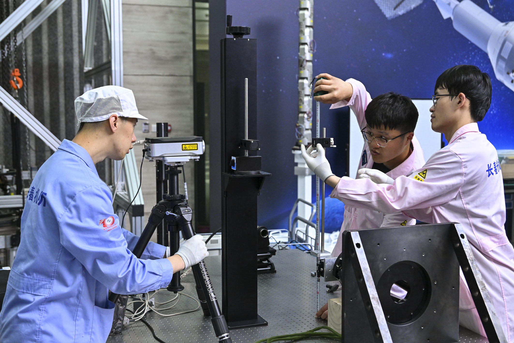 圖為中國科學(xué)院空間光學(xué)系統(tǒng)在軌制造與集成重點實驗室科研人員進(jìn)行實驗調(diào)試。 新華社記者 許暢 攝