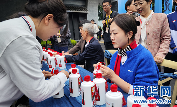 10月11日,參加茅臺(tái)酒節(jié)的嘉賓在茅臺(tái)中國酒文化城體驗(yàn)茅臺(tái)栓絲帶。新華網(wǎng) 盧志佳 攝