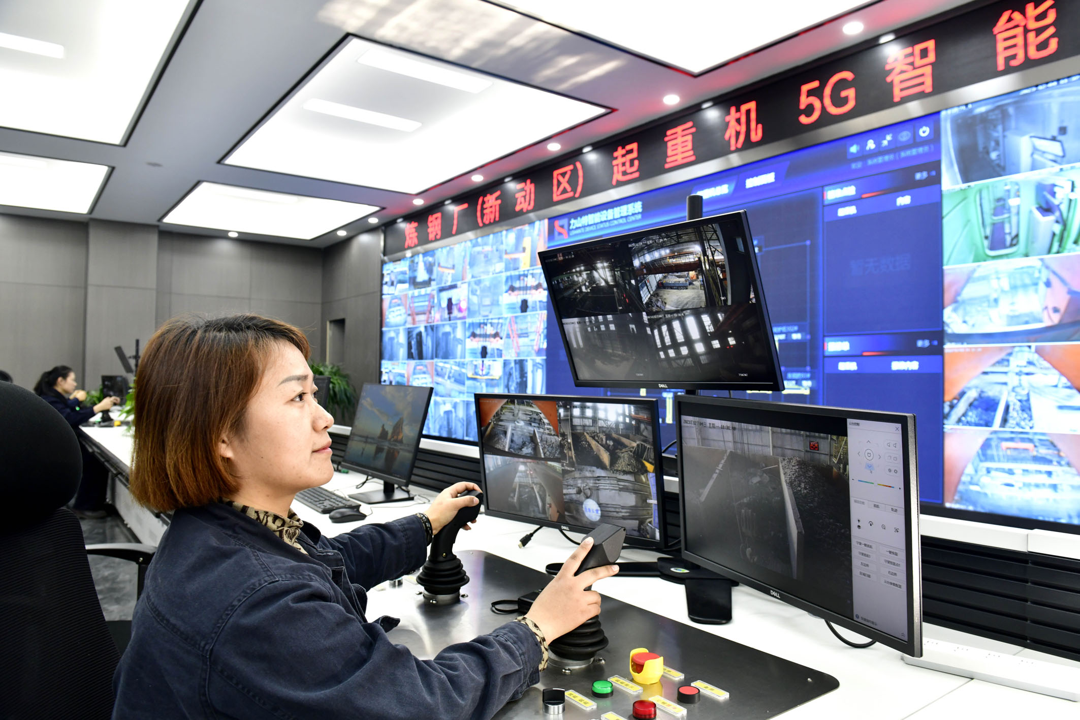 圖為工作人員在山鋼股份萊蕪分公司煉鋼廠起重機(jī)5G智能管控中心遙控操作吊運(yùn)廢鋼。新華社記者 郭緒雷 攝