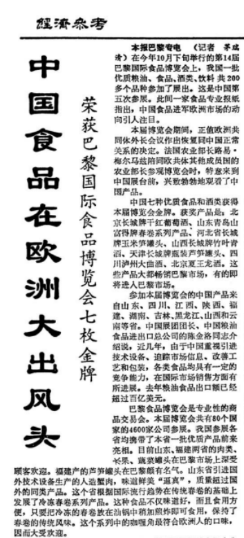 翻開1990年11月6日《經(jīng)濟參考報》,標(biāo)題為《中國食品在歐洲大出風(fēng)頭》的文章,描寫了第14屆巴黎國際食品博覽會上,我國一批優(yōu)質(zhì)糧油、食品、酒類、飲料共200多個品種參加展出的場景。其中,中國七種優(yōu)質(zhì)食品和酒類獲得該屆博覽會金牌,瀘州老窖所生產(chǎn)的“四川瀘州大曲酒”位列其中,在國際舞臺上展示出中國風(fēng)采。