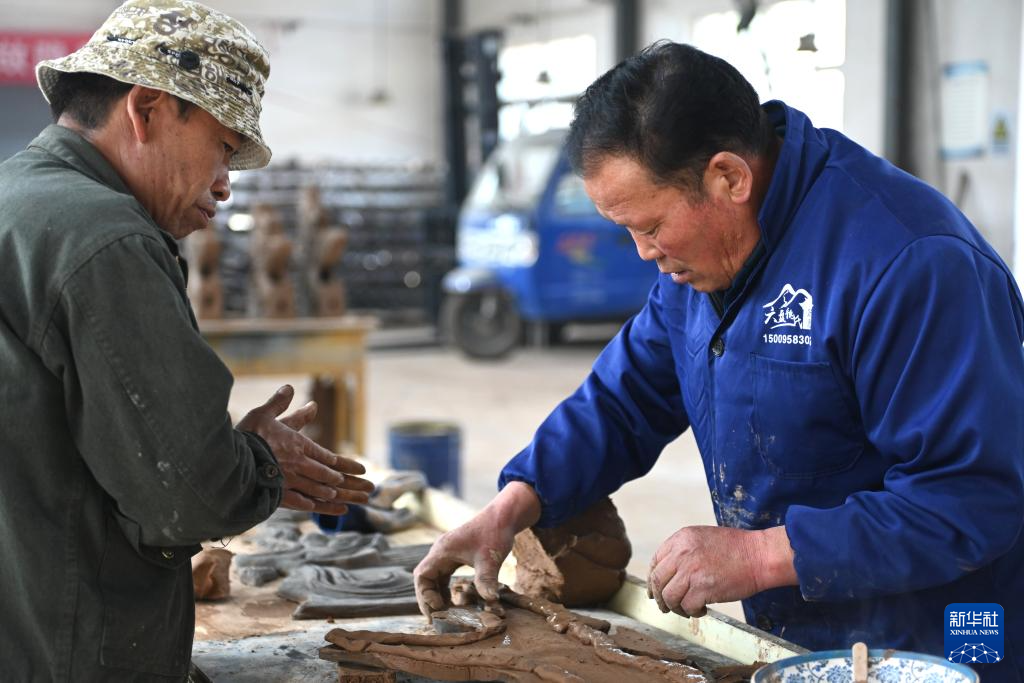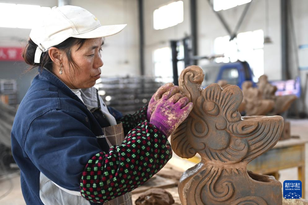 10月30日,在固原市隆德縣魏氏磚雕傳承基地,卜文?。ㄓ遥┰谏a(chǎn)車間對工人進行指導(dǎo)。