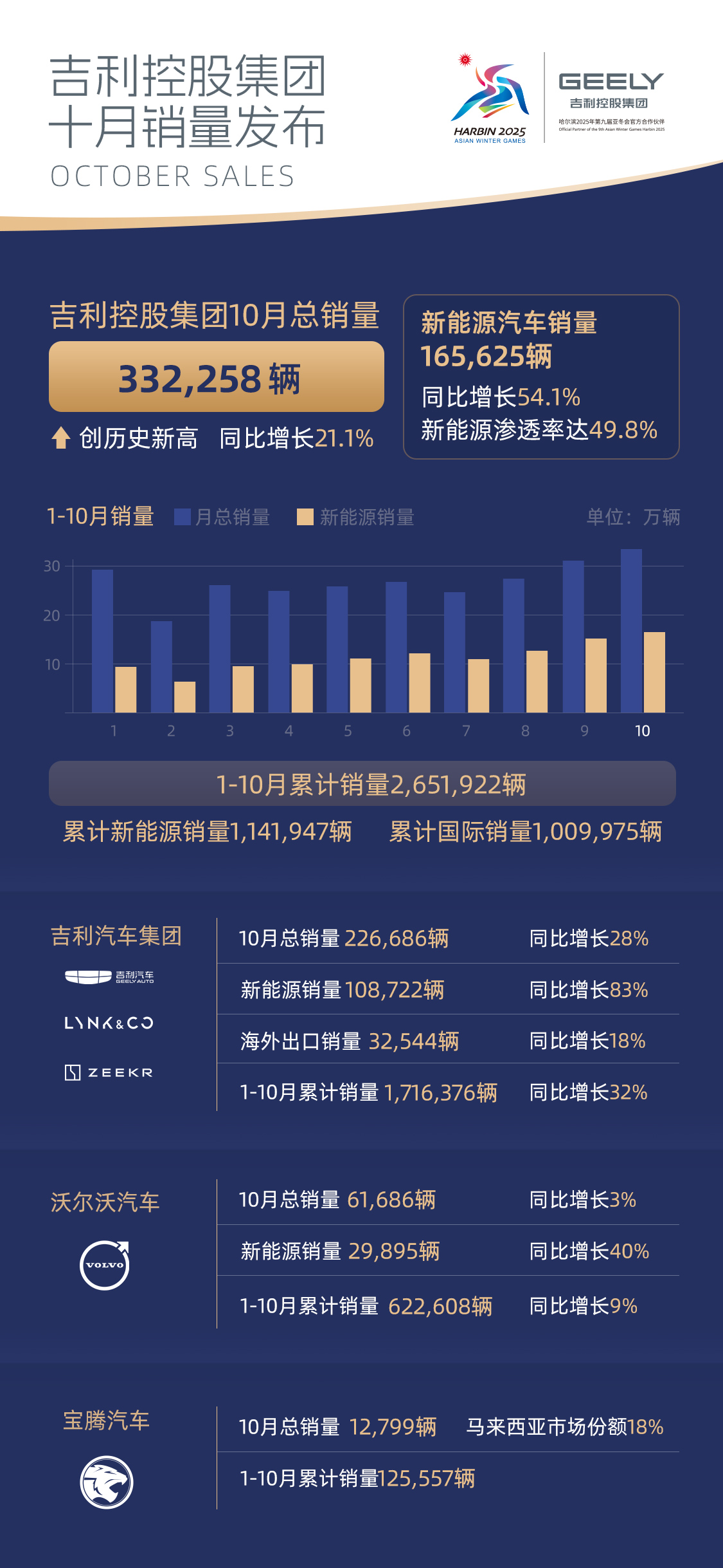 新華財(cái)經(jīng)北京11月7日電 據(jù)吉利披露,10月,吉利控股集團(tuán)總銷量332,258輛,同比增長(zhǎng)21.1%,再創(chuàng)歷史新高。其中,新能源銷量165,625輛,同比增長(zhǎng)54.1%,新能源滲透率49.8%;1-10月累計(jì)銷量2,651,922輛,同比增長(zhǎng)21.1%,累計(jì)新能源銷量1,141,947輛,同比增長(zhǎng)50.7%;累計(jì)國(guó)際銷量1,009,975輛,同比增長(zhǎng)22.7%。