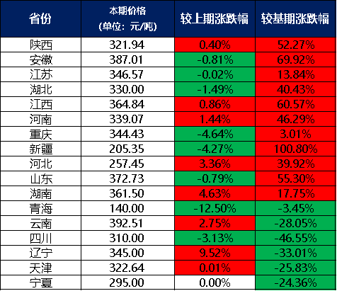 分價(jià)格區(qū)間來(lái)看,本期兩堿工業(yè)鹽單價(jià)在300元/噸及以上的地區(qū)有13個(gè),是陜西、安徽、江蘇、湖北、江西、河南、重慶、山東、湖南、云南、四川、遼寧、天津;兩堿工業(yè)鹽單價(jià)在300元/噸以下的地區(qū)有4個(gè),分別是新疆、河北、青海、寧夏。