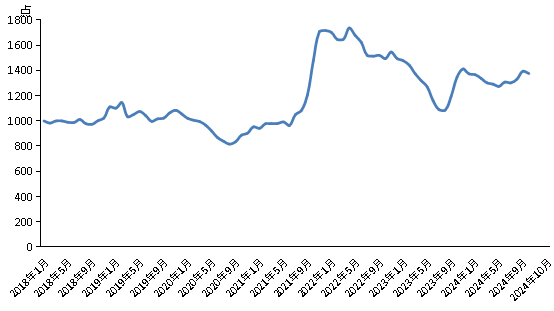 10月份,新華·中鹽兩堿工業(yè)鹽價(jià)格指數(shù)報(bào)1375.48點(diǎn),較上期(2024年9月)下跌18.20點(diǎn),跌幅1.31%;較基期(2018年1月)上漲375.48點(diǎn),漲幅37.55%;較周期內(nèi)最高點(diǎn)1736.66點(diǎn)(2022年4月)下跌361.18點(diǎn),跌幅20.80%;較周期內(nèi)最低點(diǎn)816.2點(diǎn)(2020年8月)上漲559.28點(diǎn),漲幅68.52%。