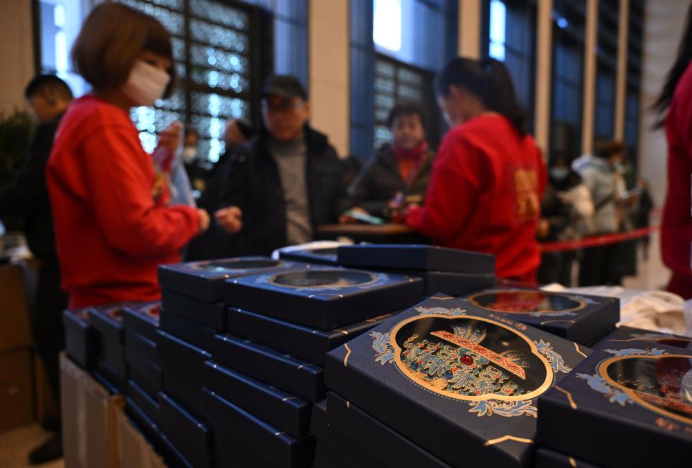 12月3日,觀眾在中國(guó)國(guó)家博物館排隊(duì)購(gòu)買鳳冠冰箱貼。新華社記者 金良快 攝