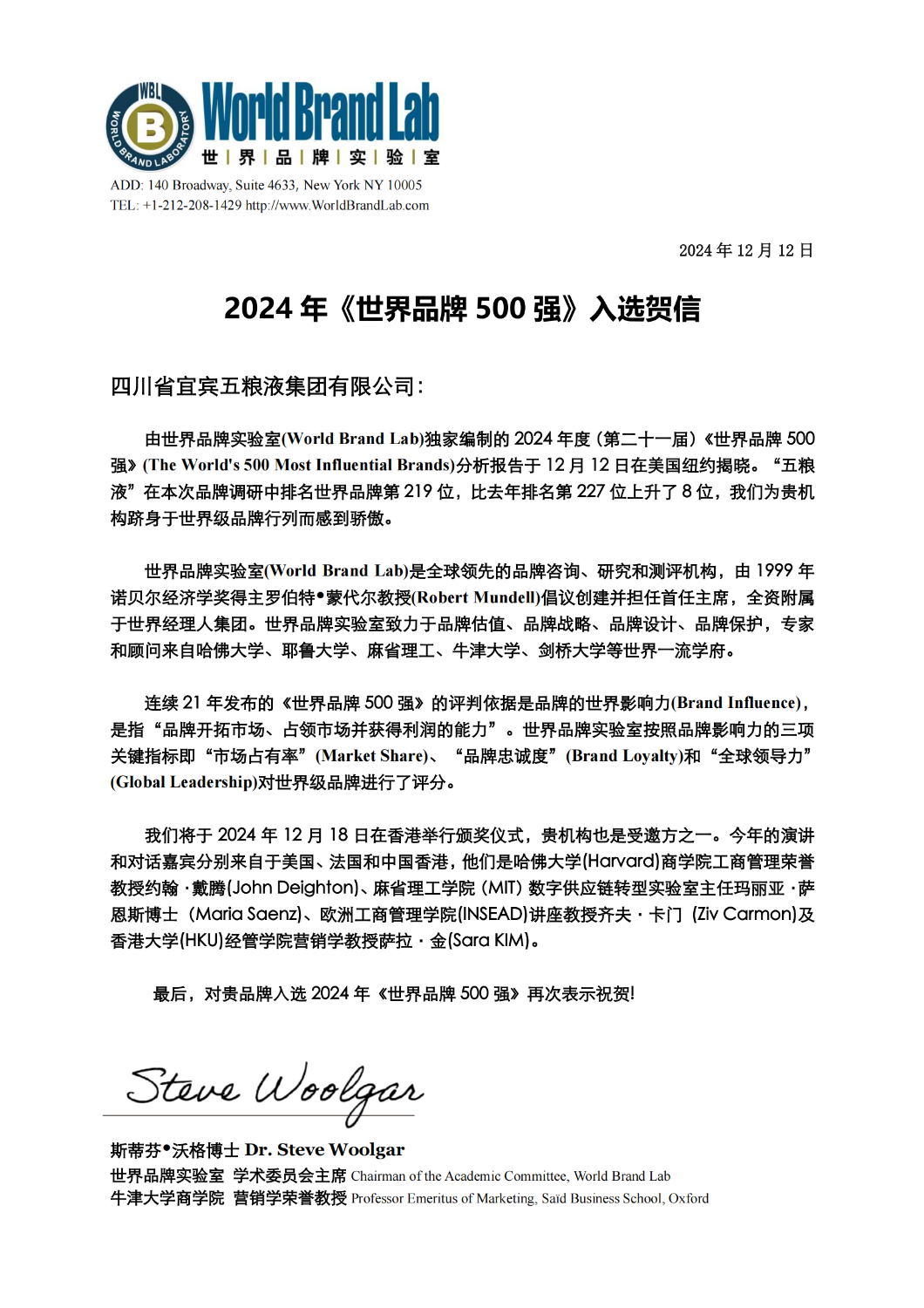 美國(guó)當(dāng)?shù)貢r(shí)間12月12日,世界品牌實(shí)驗(yàn)室于美國(guó)紐約發(fā)布了2024年度《世界品牌500強(qiáng)》榜單。五糧液連續(xù)第八年榮登榜單,品牌排名增幅位居白酒行業(yè)第一。作為白酒領(lǐng)軍企業(yè),五糧液以豐富形式持續(xù)提升品牌知名度和美譽(yù)度,不斷推動(dòng)中國(guó)白酒文化的國(guó)際化傳播,加深全球消費(fèi)者對(duì)中國(guó)傳統(tǒng)文化的理解與欣賞,成為中國(guó)品牌在國(guó)際舞臺(tái)的一張亮麗名片。