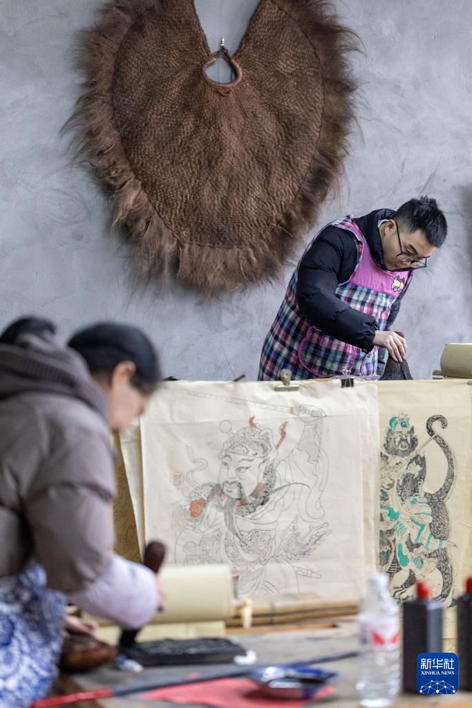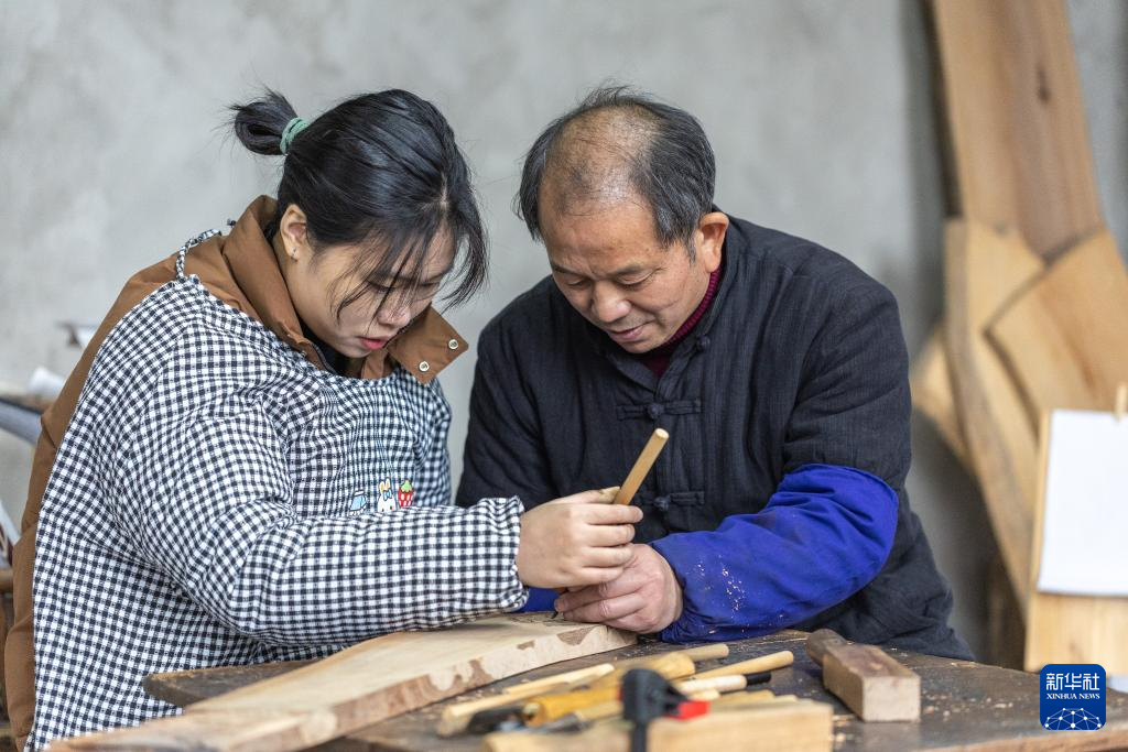1月14日,在重慶市梁平區(qū)屏錦鎮(zhèn),梁平木版年畫國(guó)家級(jí)代表性傳承人徐家輝(右)指導(dǎo)學(xué)生熊彩汝梁平木版年畫技藝。
