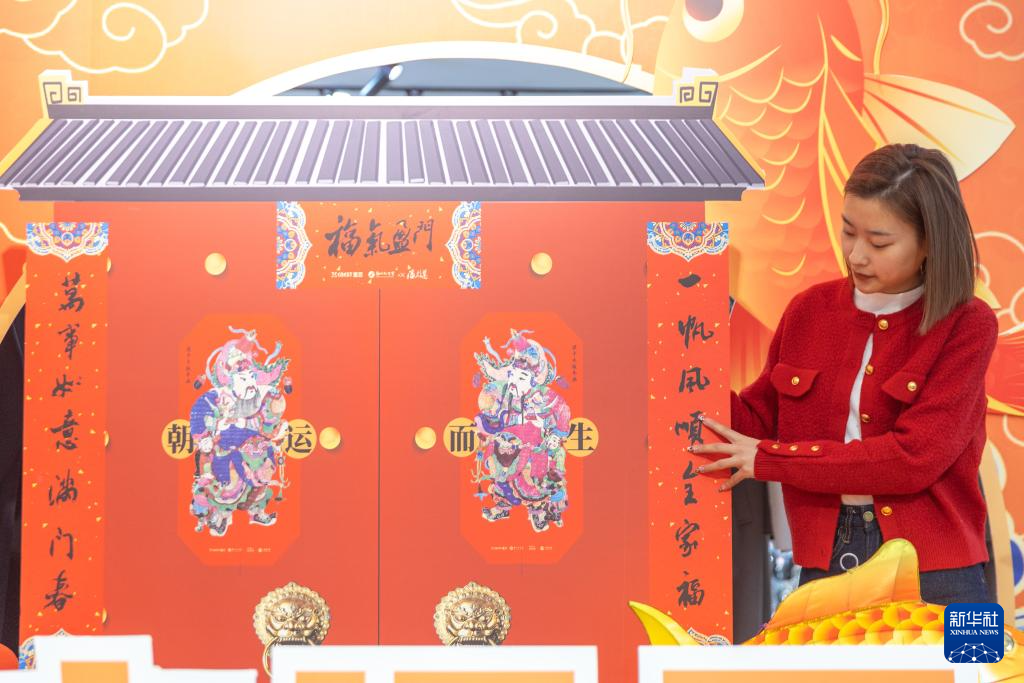 1月15日,在重慶市梁平區(qū)一商場(chǎng),商場(chǎng)工作人員在擺放帶有梁平木版年畫元素的新春裝飾。