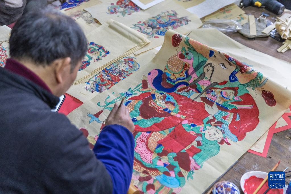 1月14日,在重慶市梁平區(qū)屏錦鎮(zhèn),梁平木版年畫國(guó)家級(jí)代表性傳承人徐家輝在工作室內(nèi)為年畫描色。