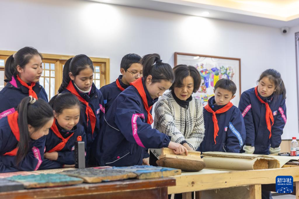 1月15日,在重慶市梁平區(qū)梁平實(shí)驗(yàn)小學(xué)少兒年畫館,梁平木版年畫市級(jí)代表性傳承人莫紹萍指導(dǎo)學(xué)生們學(xué)習(xí)梁平木版年畫的刷印。