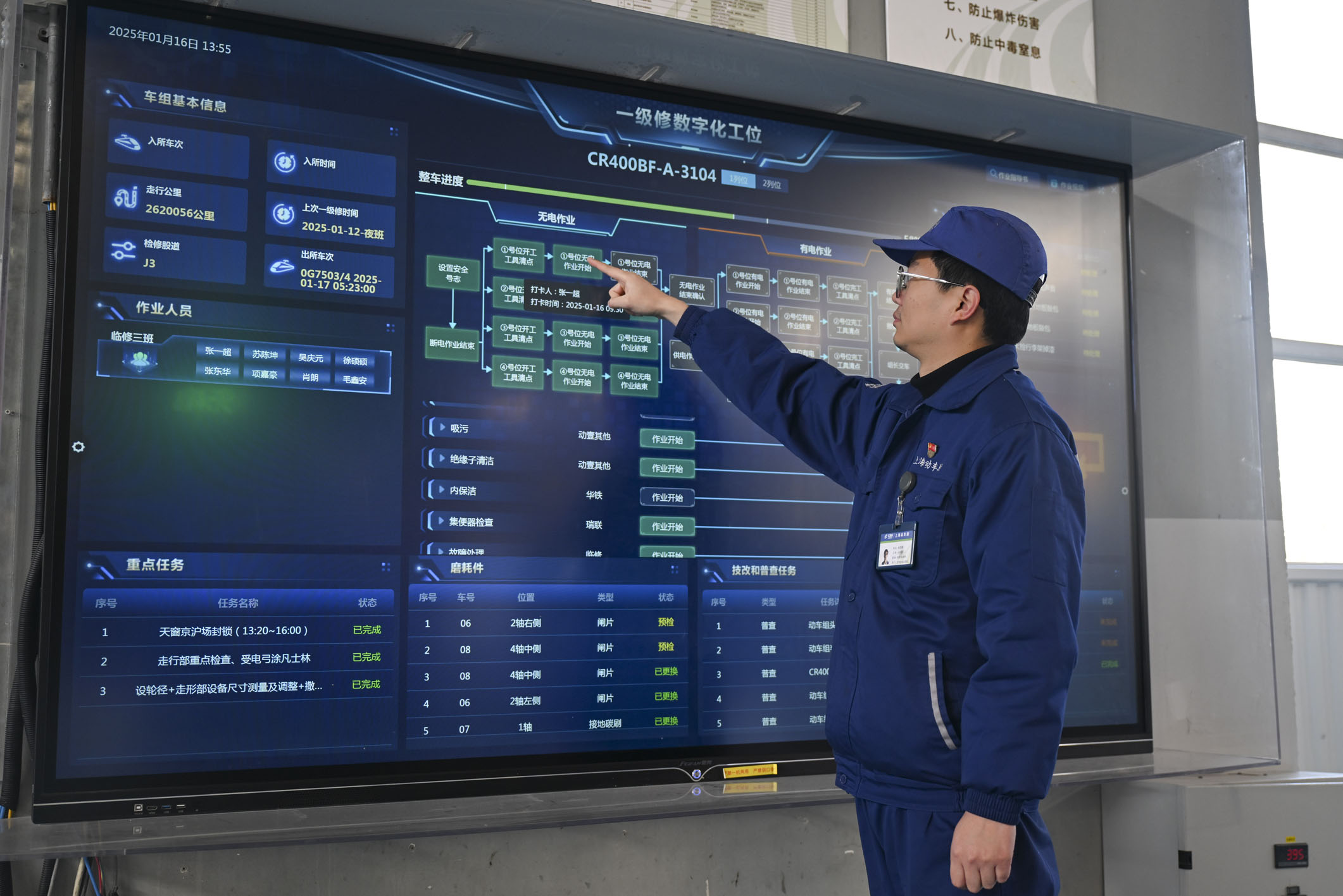 圖為近日在上海動(dòng)車(chē)段虹橋動(dòng)車(chē)運(yùn)用所,工長(zhǎng)在操作一級(jí)修數(shù)字化工位界面。
