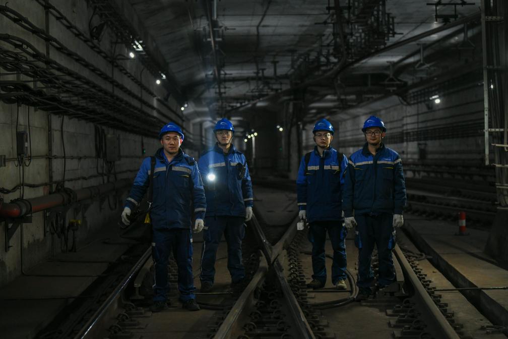 1月26日拍攝的成都地鐵北郊接觸網(wǎng)二班工作人員曾呂帥、王忠月、蔣俊偉和楊力(從左至右)。新華社記者 胥冰潔 攝