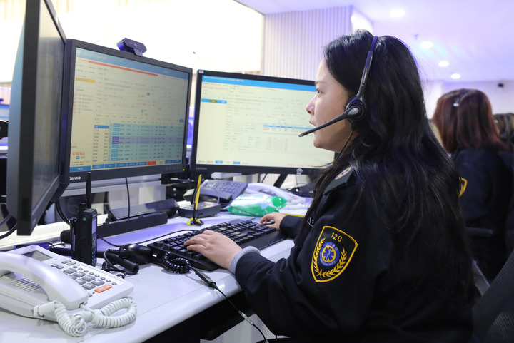 一位接線員在上海市醫(yī)療急救調(diào)度指揮中心內(nèi)接聽(tīng)120急救電話。新華社記者 方喆 攝