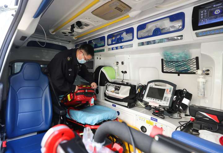 急救醫(yī)師曹鑫在出發(fā)前檢查整理救護(hù)車(chē)急救藥品和裝備。新華社記者 方喆 攝