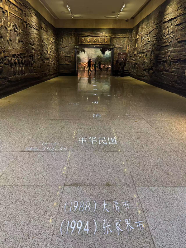 沿著展廳地面上的時間軸前進(jìn),好似時光倒流,觀眾走進(jìn)了“張家界故事”。這片土地歷史悠久,早在原始社會晚期,先民就已在澧水兩岸繁衍生息。張家界原名“大庸”,曾是古庸國所在地,1994年更名為張家界市。博物館內(nèi)萬余件藏品,無聲訴說著各個歷史時期的發(fā)展演變。