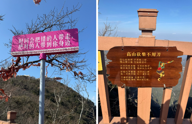 景區(qū)里的標(biāo)語標(biāo)牌,是人為制造“打卡點”的常見手法。張家界景區(qū)里沒有用“我在xxx很想你”之類的套話,而是根據(jù)景點特色用心擬了標(biāo)語,俏皮詼諧又勵志,就像同行的朋友在給登山者打氣。圍欄上懸掛著民歌、民謠和傳說故事,讓人歇腳的時候還能念上一段、唱上兩句。道旁植物上也掛著醒目的科普標(biāo)牌,行走在植物資源豐沛的山間,就像走進(jìn)了一座植物博物館。