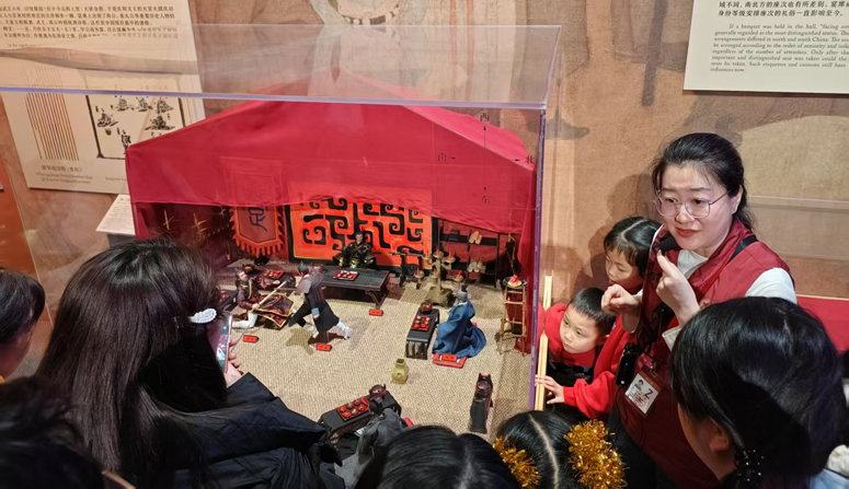 “范增作為項羽的謀臣,座次高于劉邦,這是不正常的。”在位于展覽結(jié)尾的鴻門宴場景復(fù)原展位前,修宇為觀眾詳解其中座次排列相較當(dāng)時禮制的異常之處,如何體現(xiàn)參加宴會雙方微妙的心理狀態(tài)。伴隨對種種細節(jié)的分析,展臺上的人物更顯栩栩如生,觀眾仿佛置身其中,從宴會禮儀的獨特角度再次品讀了家喻戶曉的鴻門宴故事。