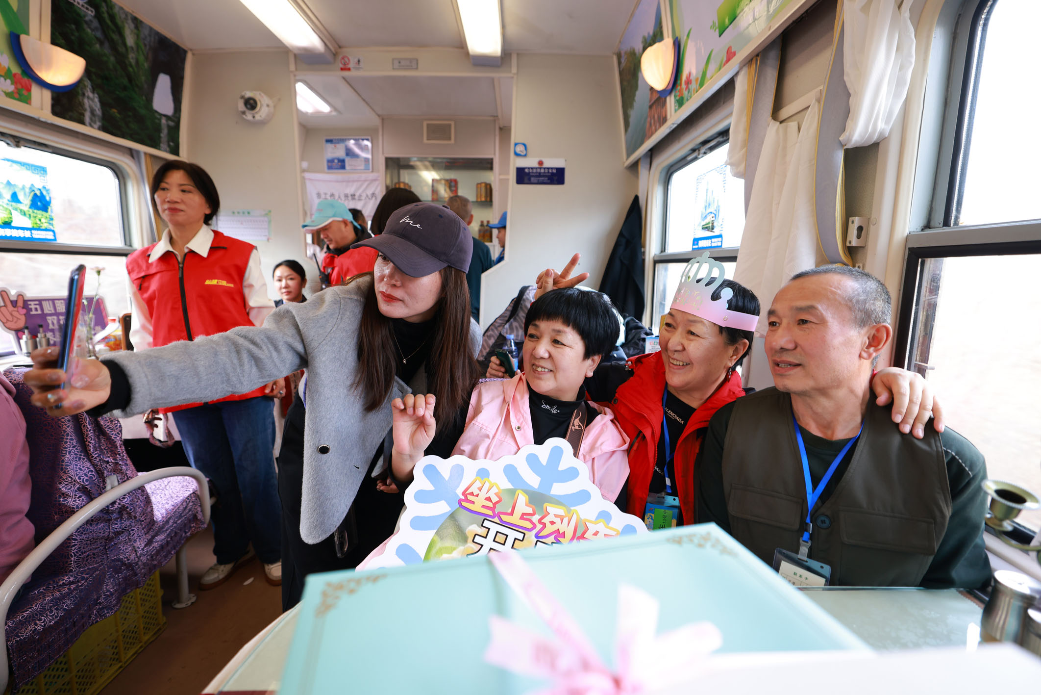 近日,在黑龍江省哈爾濱東站,546名銀發(fā)旅客踏上Y64次旅游專(zhuān)列,開(kāi)啟為期14天的旅程,這是中國(guó)鐵路哈爾濱局集團(tuán)有限公司今年開(kāi)行的首趟“銀發(fā)旅游專(zhuān)列”。圖為旅客在Y64次旅游專(zhuān)列的餐車(chē)慶祝生日。 新華社發(fā)(徐率 攝)