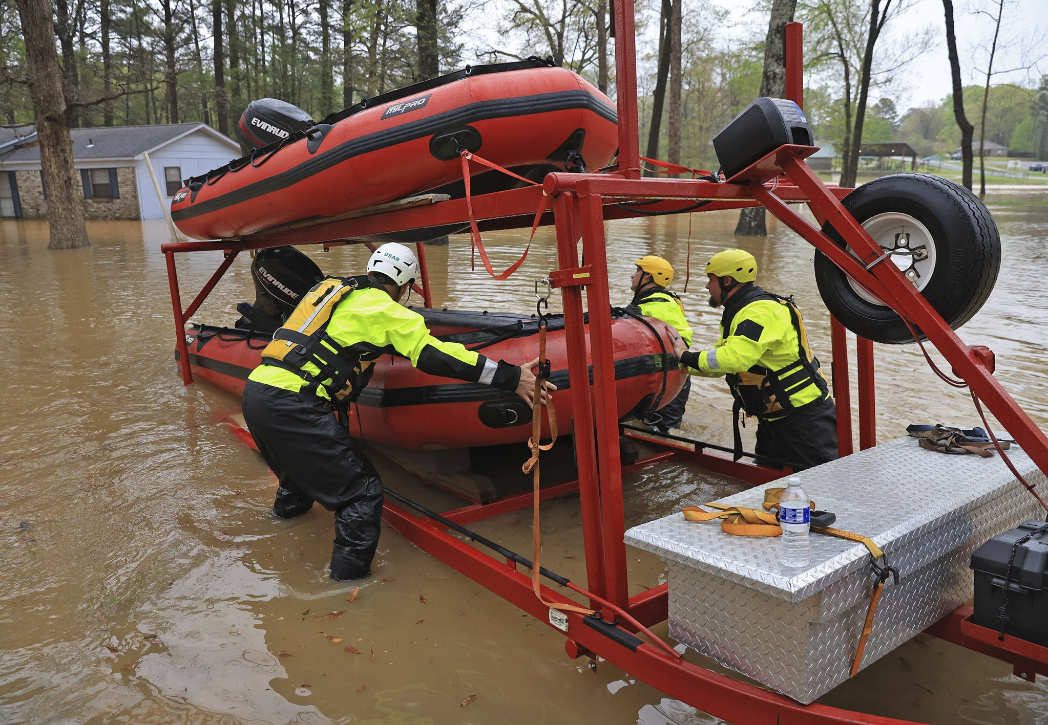 4月5日,在美國阿肯色州香農山,救援人員準備釋放搜救小艇。據外電報道,近日美國多地遭遇強降雨,導致部分地區(qū)出現洪水。